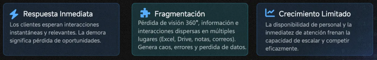 La ausencia de herramientas tecnológicas como un CRM que automaticen tareas repetitivas, consolide los leads en un solo lugar, brinde respuestas inmediatas, se traduce directamente en pérdida de tiempo, oportunidades y crecimiento.